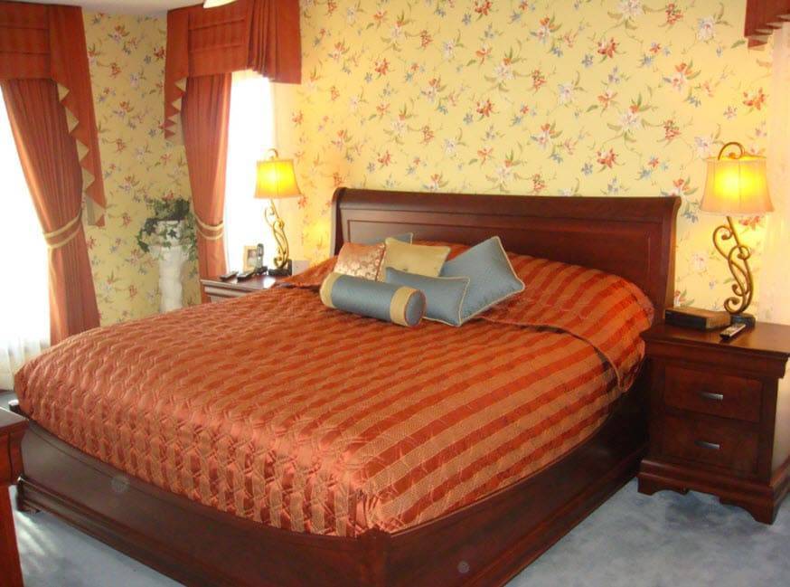 Текстильные украшения должны поддерживать единую композицию интерьера. На комплектах постельного белья и на занавесках из хлопка или льна должны присутствовать рюши и оборки, кружева и гипюр. На фоне ситцевых обоев и льняных занавесей роскошно будет смотреться атласное или шелковое покрывало.
