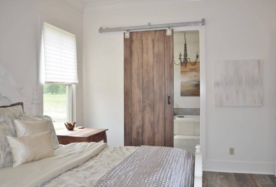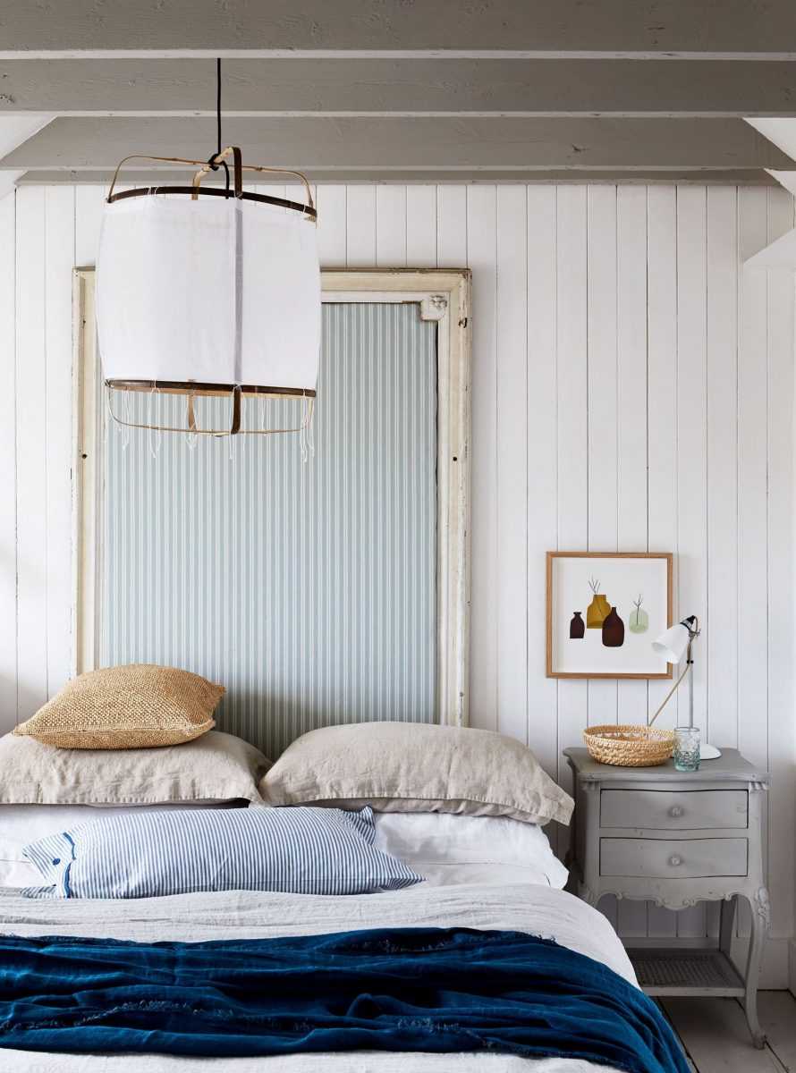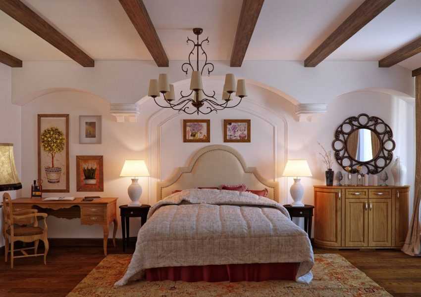 Нужно серьезно отнестись к оформлению всех поверхностей: от пола до потолка. Даже мебель должна быть изготовлена из определенного материала. Спальня может находиться под крышей или на мансарде. В этом случае не стоит закрывать балки, можно их просто покрыть лаком.
