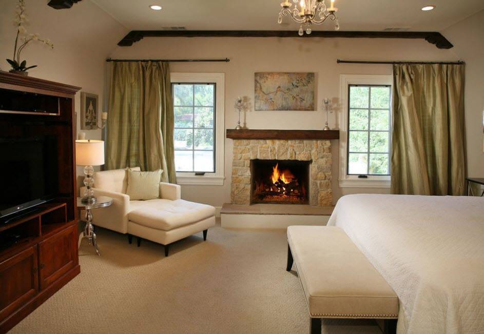 Отличным решением для стен станет фактурная штукатурка, она передаст натуральность и естественность. В такой спальне очень нужен камин. Стены и пол рядом с ним можно оформить камнем, а также сделать кирпичные вставки в на стенах.