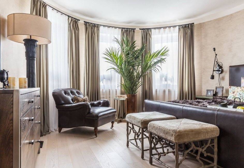 Просторная спальня в доме с эркером. В данном случае главный акцент должен делаться на дерево. Стены, потолок и пол следует окрасить в темные тона. Зону возле кровати нужно отдельно выделить, выполнив отделку декоративной штукатуркой. Украсить комнату поможет яркий текстиль, а также рисунки, картины и фотографии.