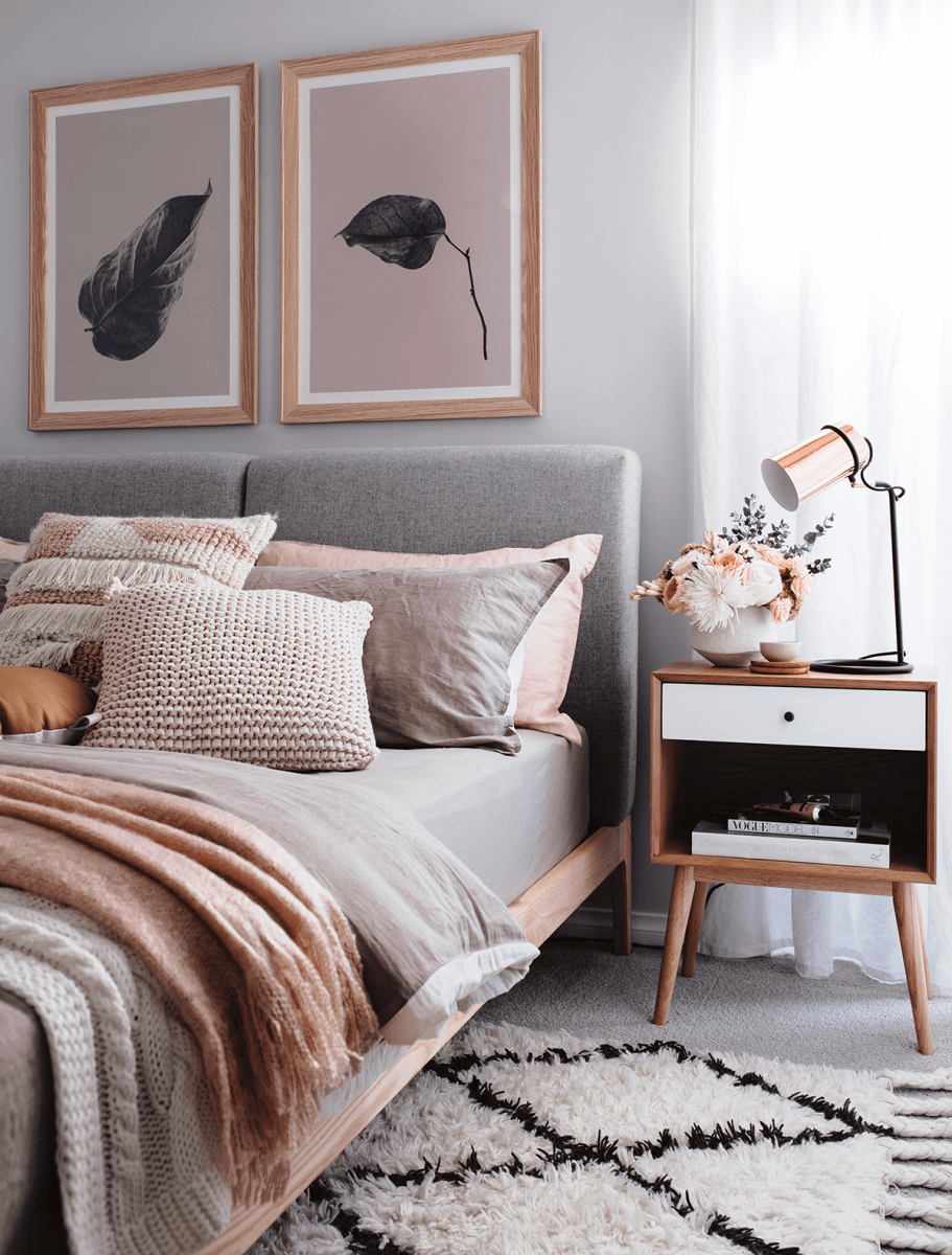 Благодаря нежным аксессуарам вы принесете в спальню мир и гармонию. Именно их присутствие позволит расслабиться и отдохнуть после напряженного рабочего дня. Светлые оттенки подушек или одеял идеально сочетаются с нежными постельными принадлежностями или стенами. Деревянный пол придаст интерьеру теплый климат. Помните также о цветах. Пионы в оттенках светло-розовых или белых роз подойдут отлично.