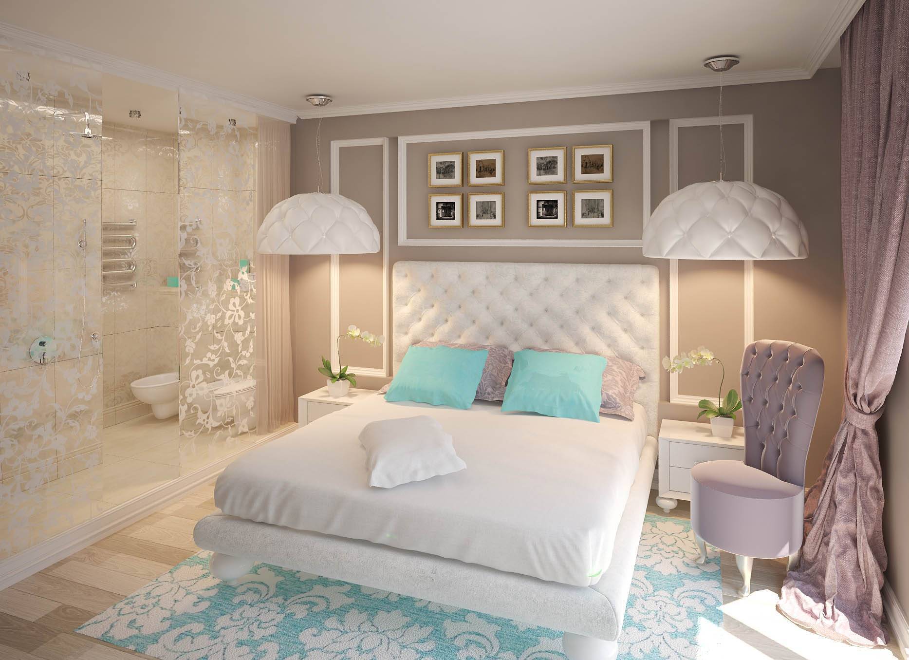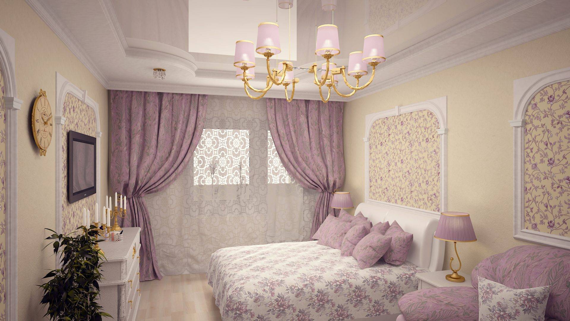 Чтобы интерьер был гармоничным, стоит подобрать красивое постельное белье и подушки в тон кровати (или стен), повесить белые шторы с сиреневым рисунком и дополнить дизайн двумя мягкими креслами, а также накидкой на подоконник. Завершающим штрихом идеи будет золотая отделка люстры, настольной лампы и двери.