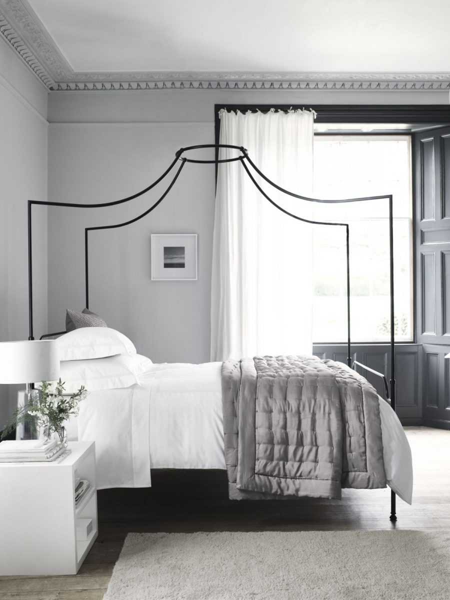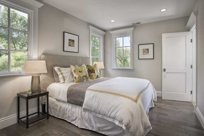 Стены, шторы или жалюзи можно оригинально отделать светло-серыми оттенками. Расставить правильные акценты помогут: изголовье кровати, фотографии, пледы, абажуры осветительных приборов на прикроватном столике.