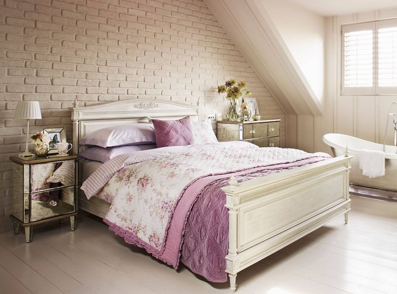 Спальную комнату обставляют мебелью, которая сделана из натурального дерева, окрашивают её в белоснежный цвет таким образом, чтобы текстура просвечивалась через краску.