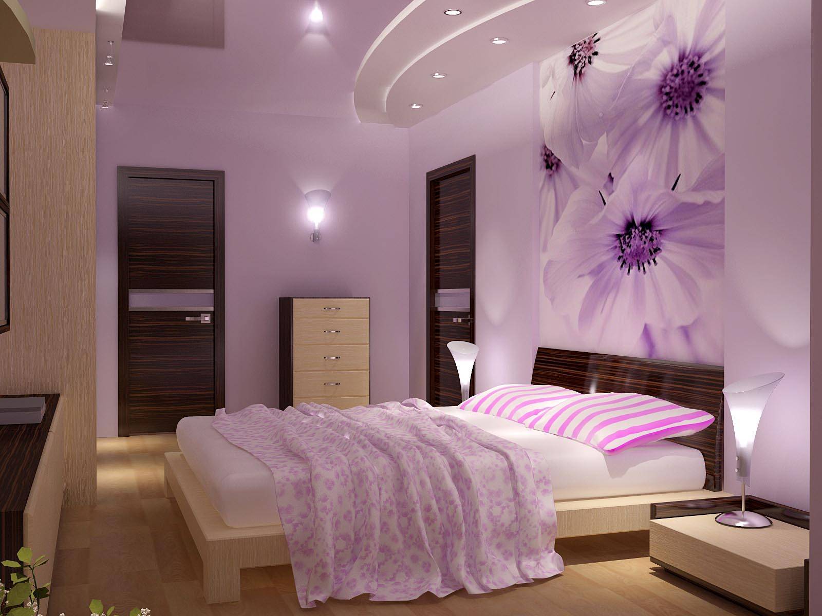 Можно подобрать кровать, тумбы, зоны потолка и пол в бежевом цвете, а стены комнаты, вазу, текстиль постельного белья и декоративные подушки – в сиреневом. Третьим оттенком станет белый, который будет украшать кружевным рисунком фасад шкафа, а также несколько мягких подушек. Мягким приемом, обеспечивающим плавный переход тонов, в данном дизайне является освещение: включенные лампы как нельзя лучше подчеркивают границы, но при этом они соединяют их бело-бежевым тоном.