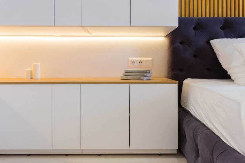 Прикроватные тумбочки станут полезным, но необязательным элементом. При отсутствии свободного места их роль может сыграть полочка над изголовьем.