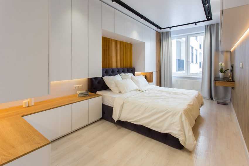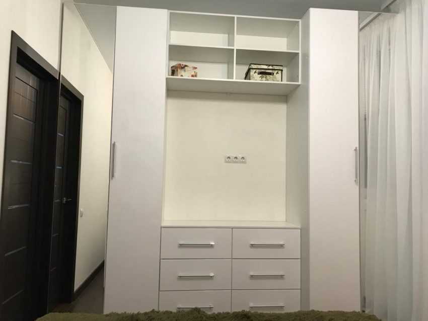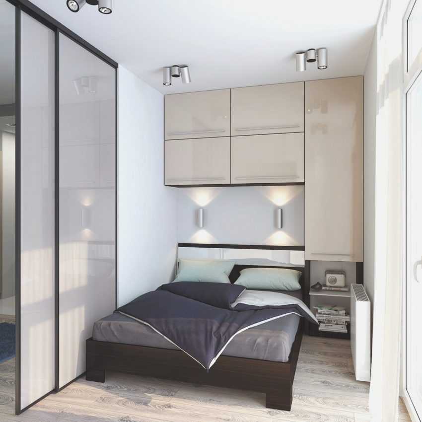 Шкафы-купе и угловые конструкции для хранения идеальны в маленьких спальнях. Встроенные шифоньеры отличаются от стандартных тем, что имеют всего лишь каркас и фасад с раздвижными дверцами. Поскольку простираются до потолка и устанавливаются прямо на пол или подготовленную ровную поверхность, некоторые детали делать не имеет смысла.