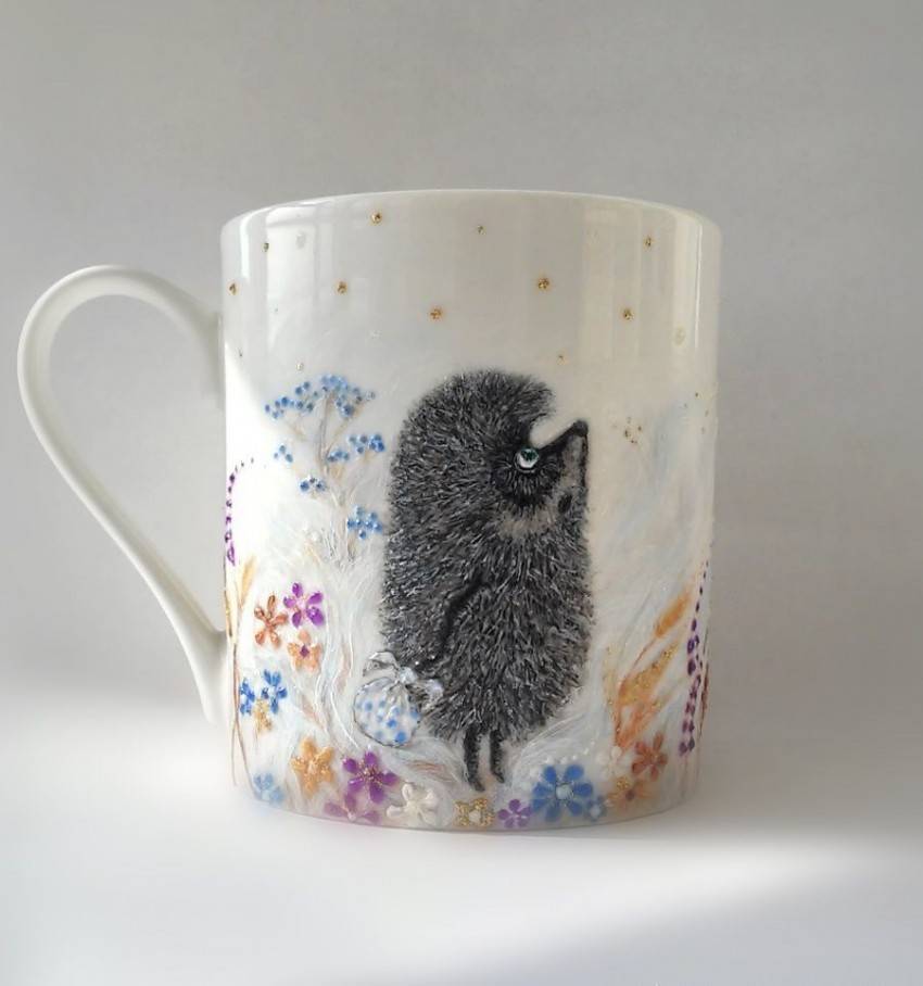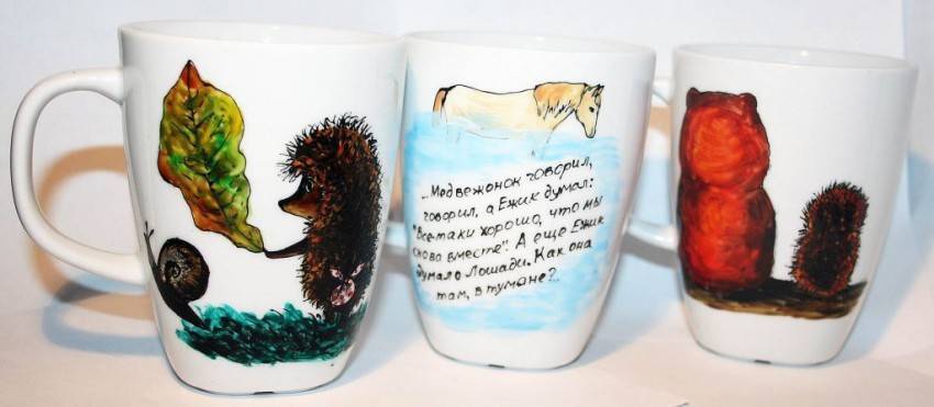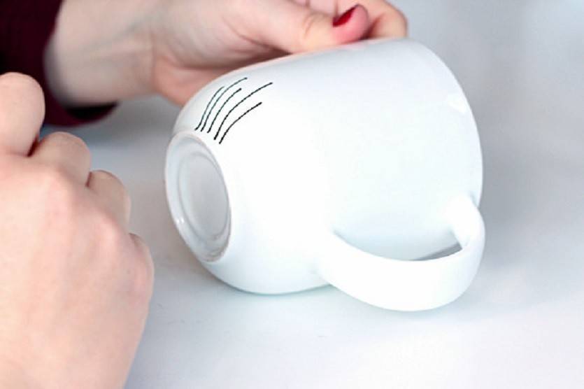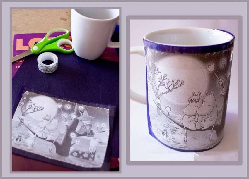 Когда все детали готовы приступаем к их фиксации на поверхности предмета. Каждый элемент прикладываем к кружке по отдельности, предварительно смазав место клеем.