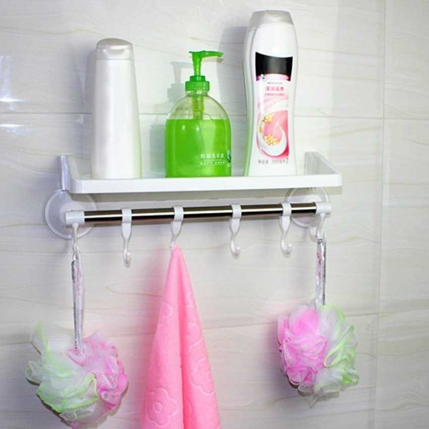 Существуют полки на присосках. Они не требуют подготовки отверстий. Однако степень надежности подобной конструкции снижается по мере того, как на нее будут помещаться другие предметы.