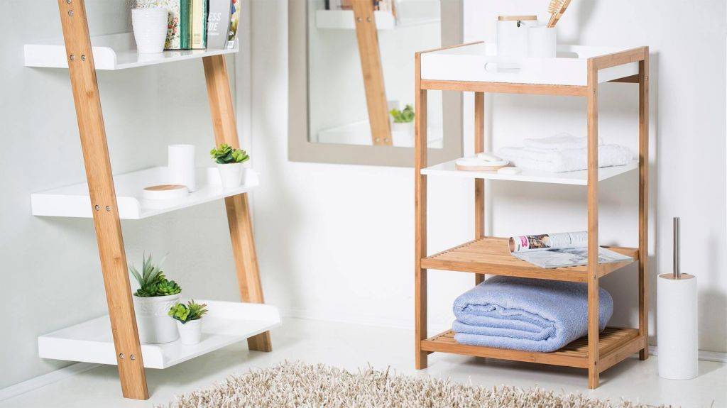 Данный вариант скрадывает пространство, т. к. устанавливается на полу. Даже угловая модель требует выделить участок площади. По этой причине стационарные полочки в ванную рекомендуется приобретать для установки в крупногабаритных помещениях.