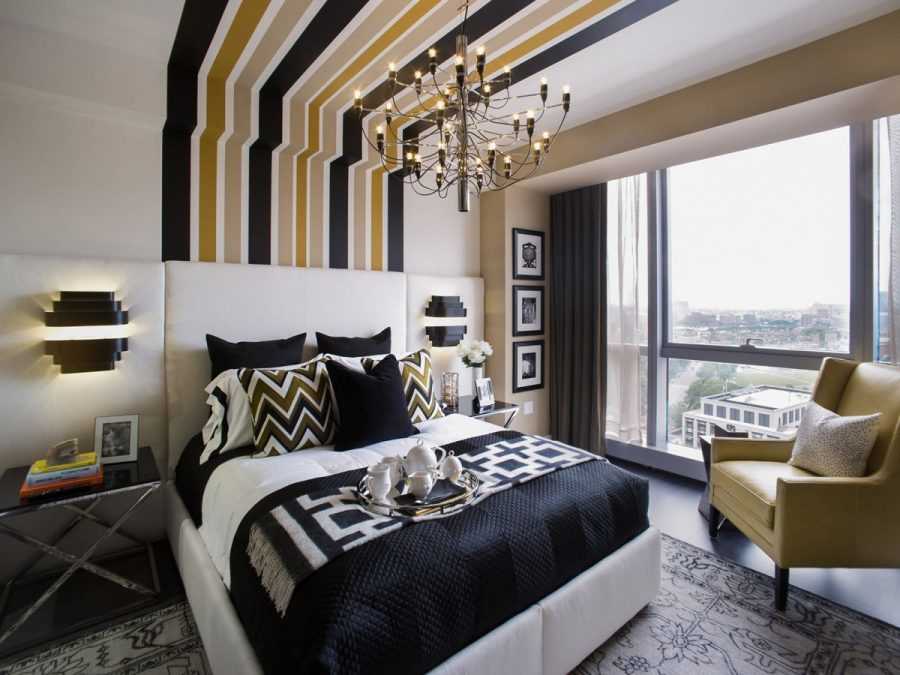 Оригинальность оформления спальни позволяет использовать большое количество зеркал, достаточного числа осветительных приборов, применение контрастов. Кроме этого, в отделке допустимо использование: