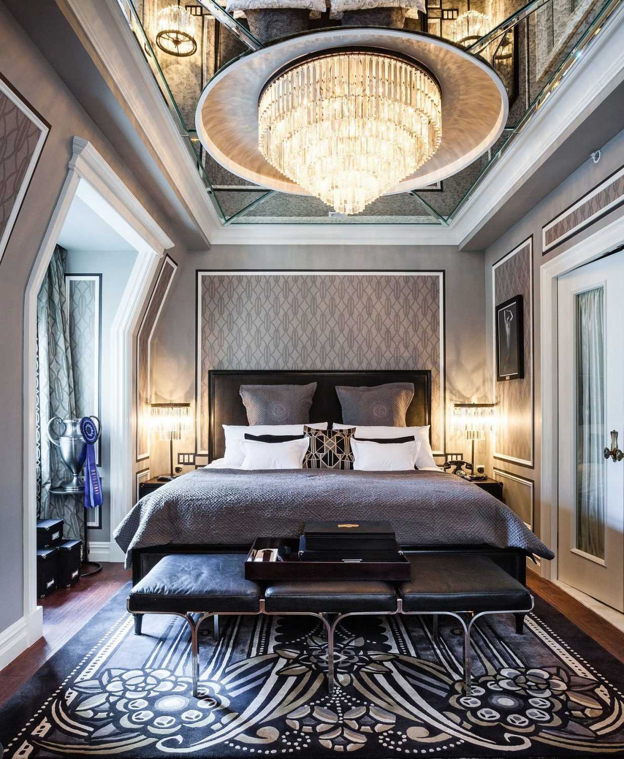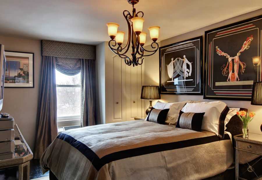Арт-деко допускает присутствие разных дизайнерских направлений, при этом обязательно гармоничное их сочетание. К примеру, антикварный туалетный столик может стоять в одной комнате с тумбочками стиля Модерн, но они должны иметь объединяющие элементы, например, общую цветовую гамму или элементы отделки. Пространство интерьера выстраивается вокруг композиционного центра – большой кровати. При этом акцентом является ее изголовье – высокое, обитое кожей или тканью. Элегантно смотрится эта деталь, выполненная из массива дерева, с резным орнаментом.