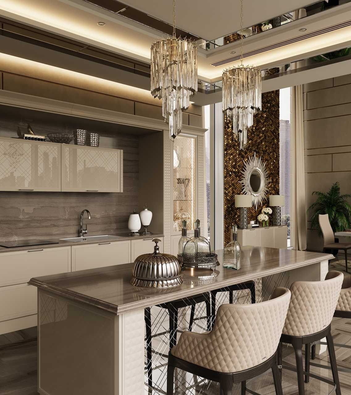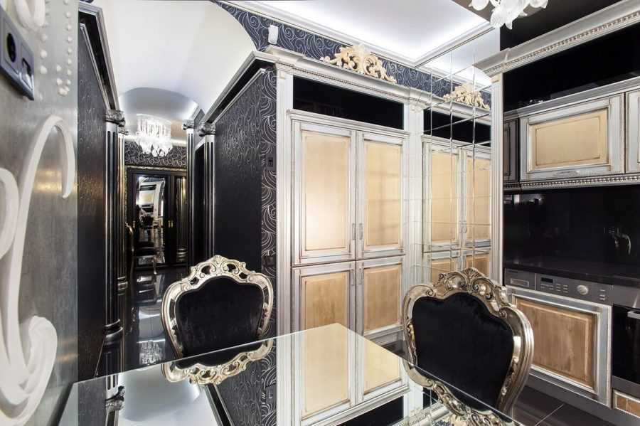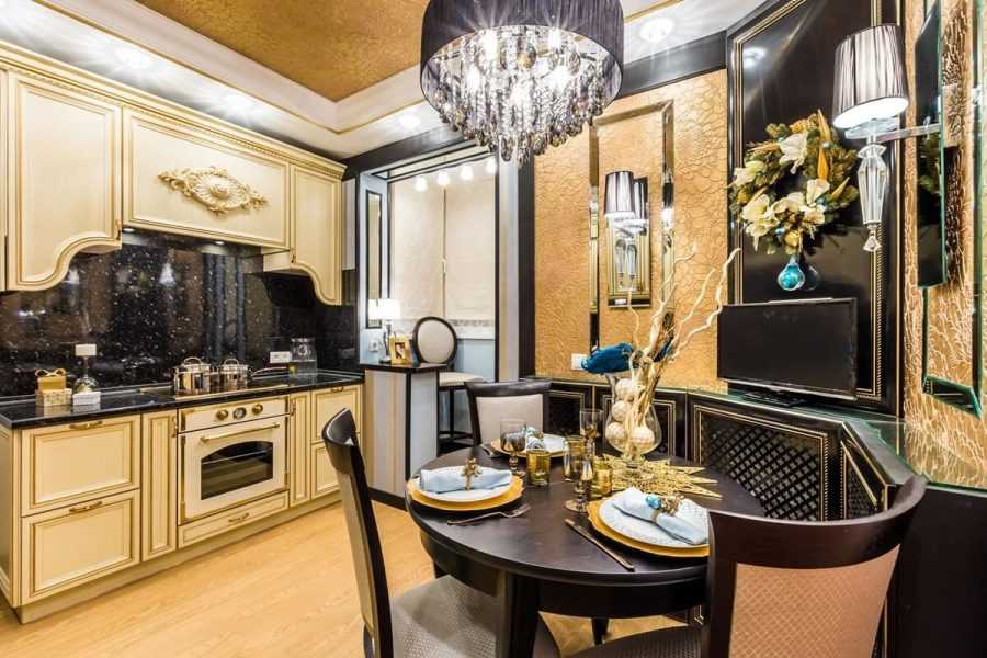 При подборе мебели необходимо руководствоваться одним правилом: гарнитур должен выглядеть богато и утонченно. Стол и стулья обеденной группы обычно сочетаются между собой. Подойдет стол из благородной древесины или стекла, а к нему – стулья с изогнутыми ножками и резьбой. Можно выбрать как мягкие сиденья, обитые бархатом или натуральной кожей, так и жёсткие – с металлическими элементами. В просторной кухне также ставится диван или уголок, создавая уютное место для приема гостей.