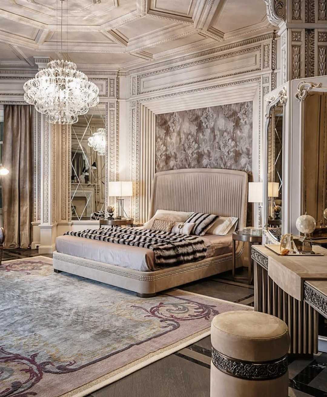 Спальная зона в данном направлении дизайна считается важным объектом, который требует повышенного внимания. Высокое изголовье с хромированными элементами, сочетающее в себе инкрустацию ювелирных камней никого не оставит равнодушным.