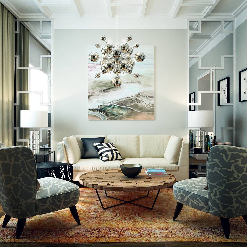 При планировании гостиной арт-деко особое внимание следует уделить освещению. Никакие современные или минималистичные светильники не будут смотреться в таком интерьере – чем больше украшений, тем лучше