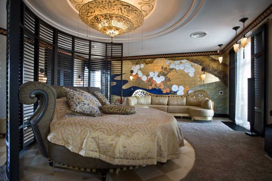Искусство должно прослеживаться в основных элементах оформления: эффектном изголовье, картинах, статуях. Чувственность обстановке добавляет обтекаемость форм предметов, использование шкур животных.