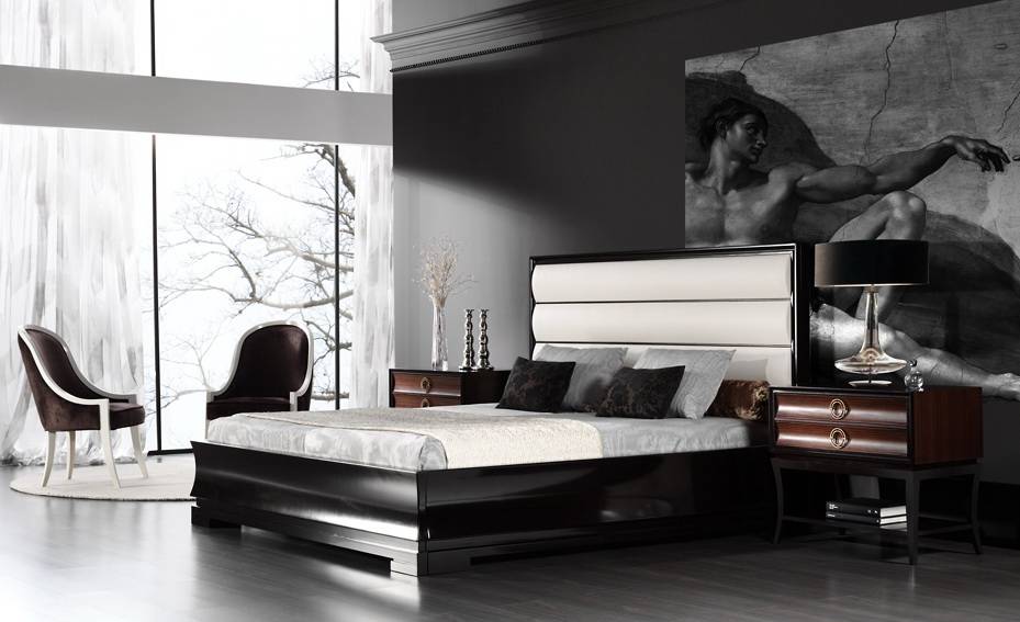 - Подойдёт необычная, роскошная, но при этом практичная и удобная мебель любого оттенка. Она может быть полированная, лакированная, с инкрустациями или вкраплениями металла. Принято соблюдать правило: если стены и потолок светлые, то мебель нужна тёмная, и наоборот. Очень ценится оригинальная форма и ручная работа. Кровать может быть с мягким и вычурным изголовьем прямоугольной или овальной формы. Приветствуется дорогая обивка.