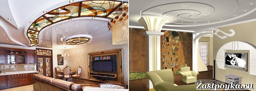 Проекты дизайна в стиле ар-деко часто ассоциируют с обликом домов кинозвезд «золотой эпохи» Голливуда. Разумеется, от обычных потолочных панелей придется отказаться полностью — они категорически не впишутся в общую канву. Зато приветствуются единичные зигзагообразные включения, которые разбавляют обычные прямые контуры высокого потолка. Стандартным решением для такого стиля является и «египетский полукруг», символизирующий рассвет. Такой принт в красно-оранжевых и золотисто-желтых тонах уместен даже в самом аристократическом ответвлении дизайна с претензией на высший шик.