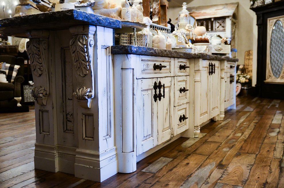 На деревянных элементах допускаются, даже приветствуются резные орнаменты и инкрустации. Обязательный элемент – витые ручки, которые очень похожи на ручную работу. Часто для создания особой атмосферы используются эмалевые краски для покрытия поверхностей.