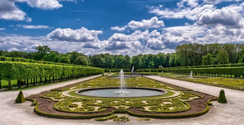 Регулярный парк французский с прямой, как стрела, центральной дизайне в барочного особняка смотрится органично очень. А особое очарование ему придают античные белые статую и классический круглый фонтан.
