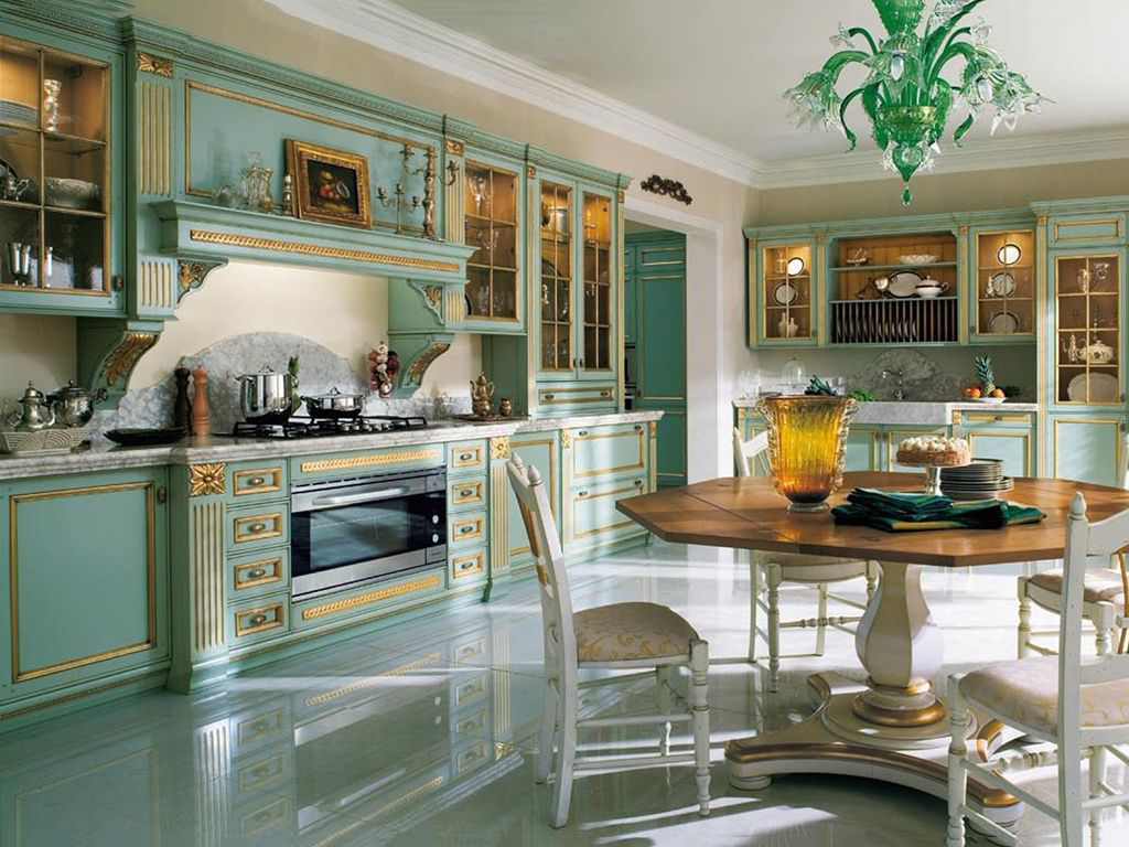 Кухонному гарнитуру следует уделить особое внимание. Он должен быть вычурным, удачно сочетать в себе основательность и изящность