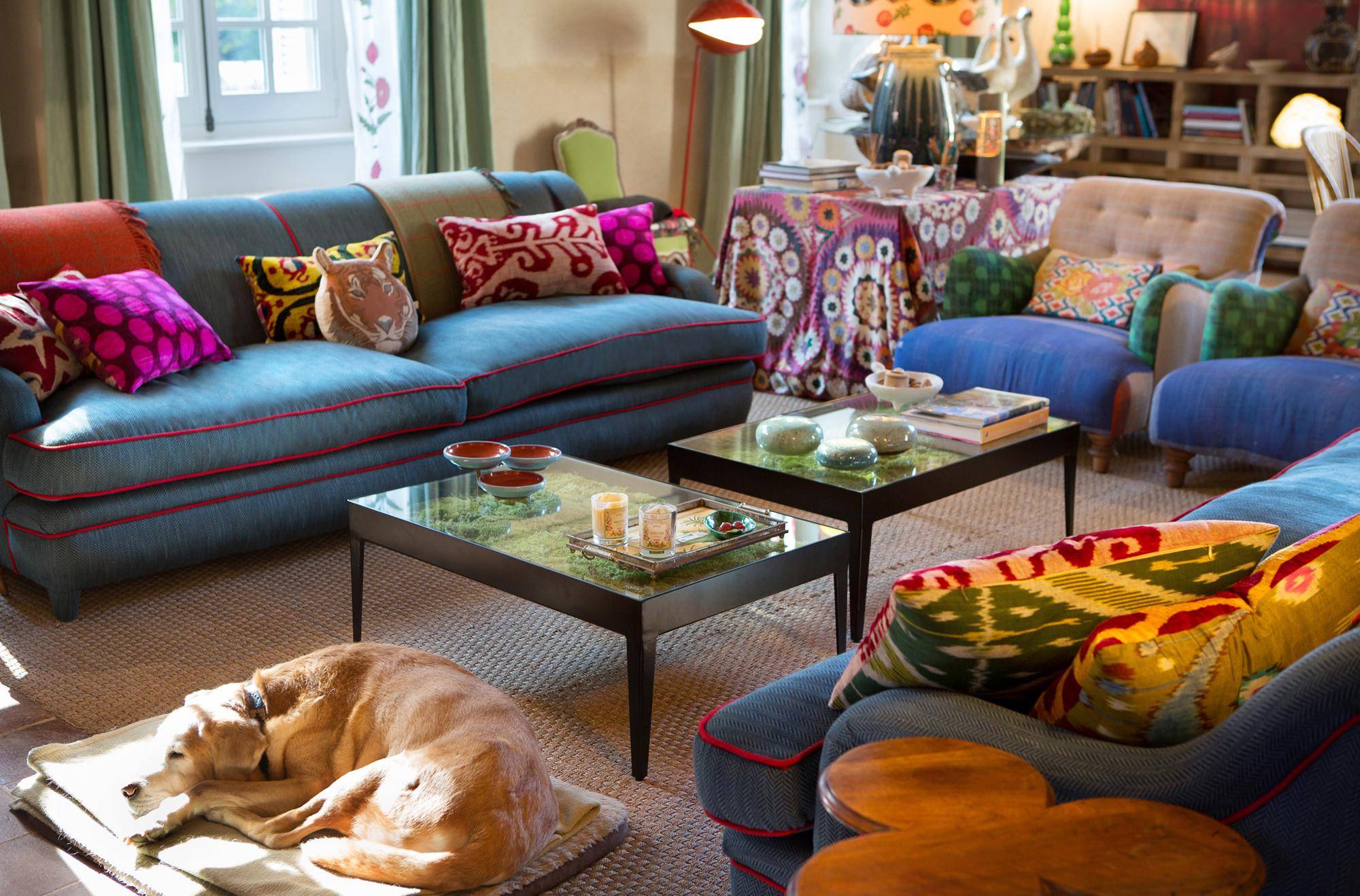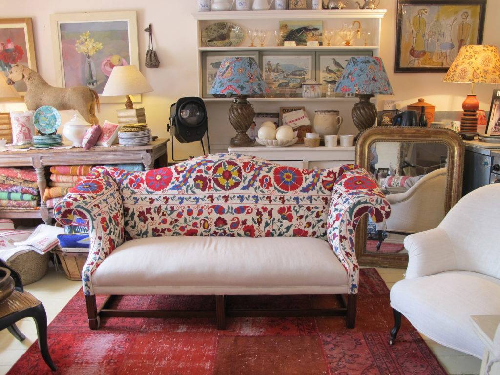 На первый взгляд кажется, что рядом располагаются случайные предметы: дизайнерский абажур, винтажная мебель, лоскутное одеяло, египетские статуэтки и прочее.
