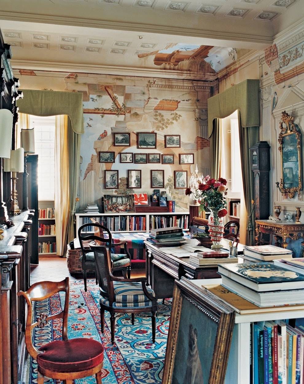 Изучая фото интерьера в стиле бохо, можно увидеть плетенные из ротанга кресла и стулья, диваны в стиле барокко, столики в винтажной обработке, кожаную мебель. Часто книги размещаются просто на полу возле необычного столика с коваными ножками, на стене за которым располагается большое зеркало в раме, украшенное сверкающими камнями. Рядом с такой экспозицией в углу можно организовать уголок для чтения, закрытый ярким балдахином, где на полу небрежно расставлены кресла-мешки, которые используются в качестве стульев.
