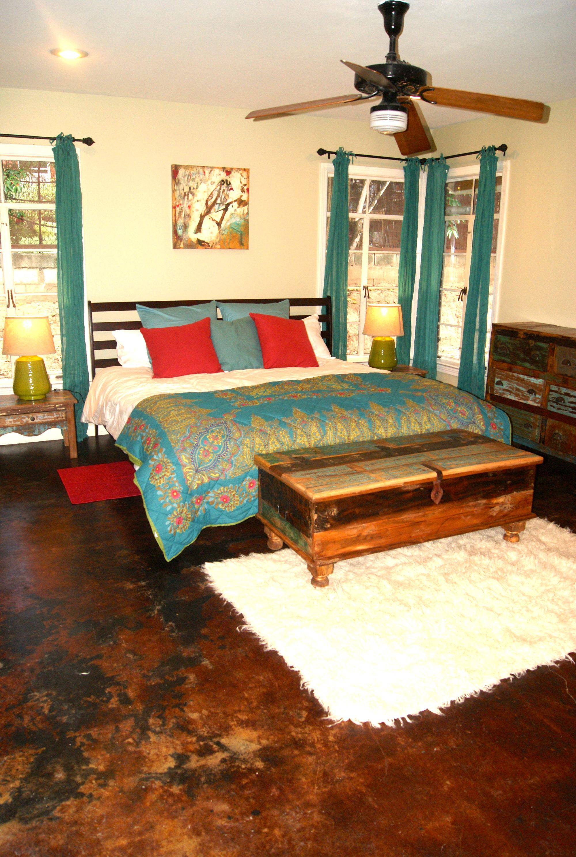 Спальня в стиле бохо с большой кроватью и состаренной прикроватной тумбочкойИсточник itsmejd.com