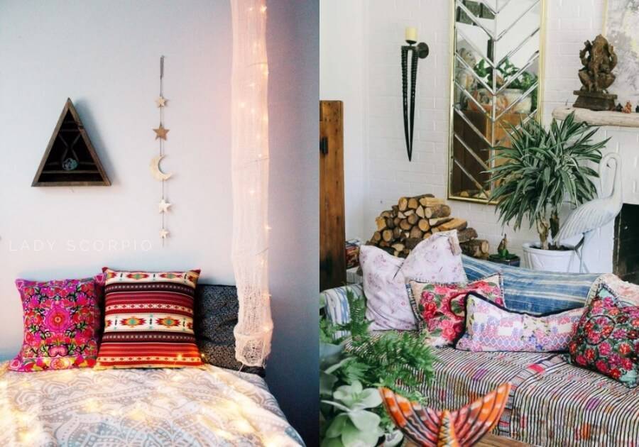 Подойдут ткани с этническими принтами и с «сумасшедшими» сочетаниями цветов и оттенков. Дополнят интерьер в стиле Бохо картины и различные произведения искусства, например, небольшие статуэтки в виде женских фигурок.