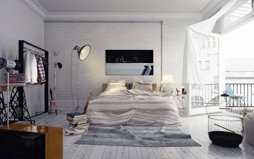 - Чтобы спальня соответствовала стилистике, оставьте одну из стен необработанной.