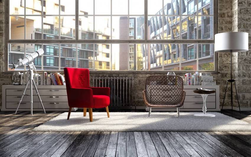 Пол с ковролиновым покрытием будет неуместен. Также в лофтах не используют большие напольные ковры. Их лучше заменить натуральной овчиной или шкурами.