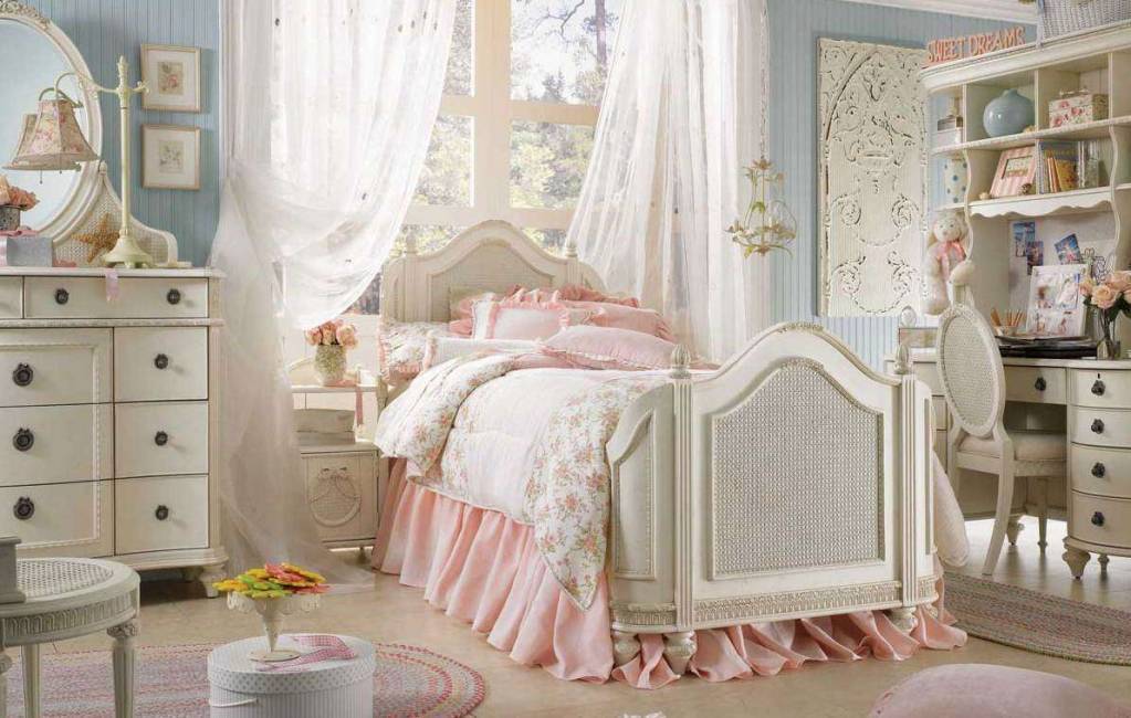 В комнате много текстиля, но за счет светлых тканей помещение не кажется перегруженным. Шелковые чехлы для подушек, такие же покрывала с нежными рисунками в пастельных тонах только украсят интерьер. Постелите на стол и полки кружевные или вязаные салфетки, скатерти с оборками или кружевной тесьмой.