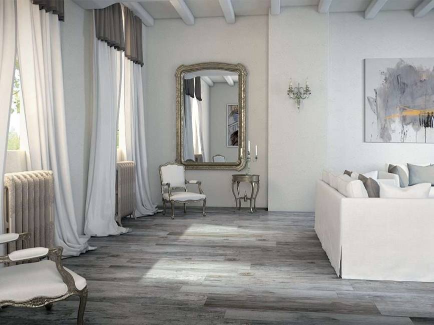 Полы деревянные — это классический и идеальный выбор для данного стиля. Паркетная доска должна быть искусственно состаренная. Завершающим штрихом выступит потертый ковер.