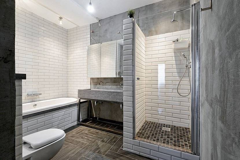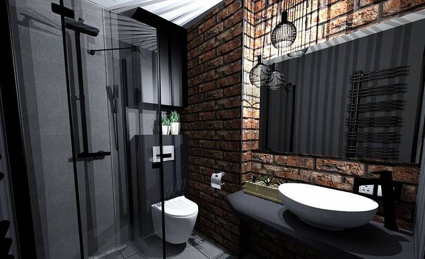 Индустриальные мотивы естественно вписываются в дизайн ванной. На стенах создают имитацию кладки. Роскошно смотрится плитка или панели под кирпич. Если помещение маленькое, то вместо стандартной красной облицовки применяют белый глянец. Отражающий слой создаст визуальный эффект увеличенной площади.