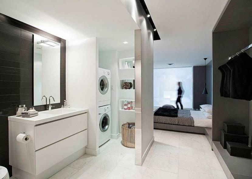 Унитаз ставится либо угловой, заметно экономящий пространство, либо не требующий бачка и крепящийся непосредственно к стене. Стены делаются в светлых тонах, а пол покрывается плиткой, цвет которой идентичен цвету стен. Раковина для умывания совмещается со стиральной машиной, или устанавливается стеклянная, совершенно незаметная на общем фоне. Дополняется интерьер зеркалом большого размера, дающим неповторимый визуальный эффект, и настенными шкафчиками, своим цветом сливающимися со стенами.