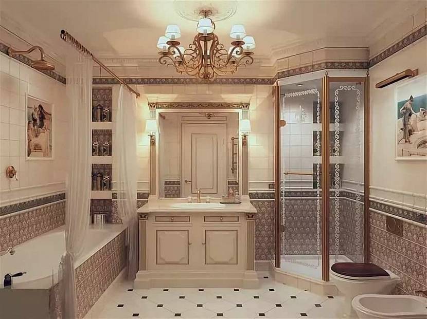 Чашу ванны устанавливают на подиум, облицовывают по бокам плиткой. Внизу можно организовать систему хранения для бытовой химии. На стене располагают крупное панно из мозаики. Для комнаты с душевой кабиной вместо раздвижной перегородки часто монтируют штору на рельсах. В классических санузлах присутствует окно – настоящее с драпировками или фальшивое (светильник).