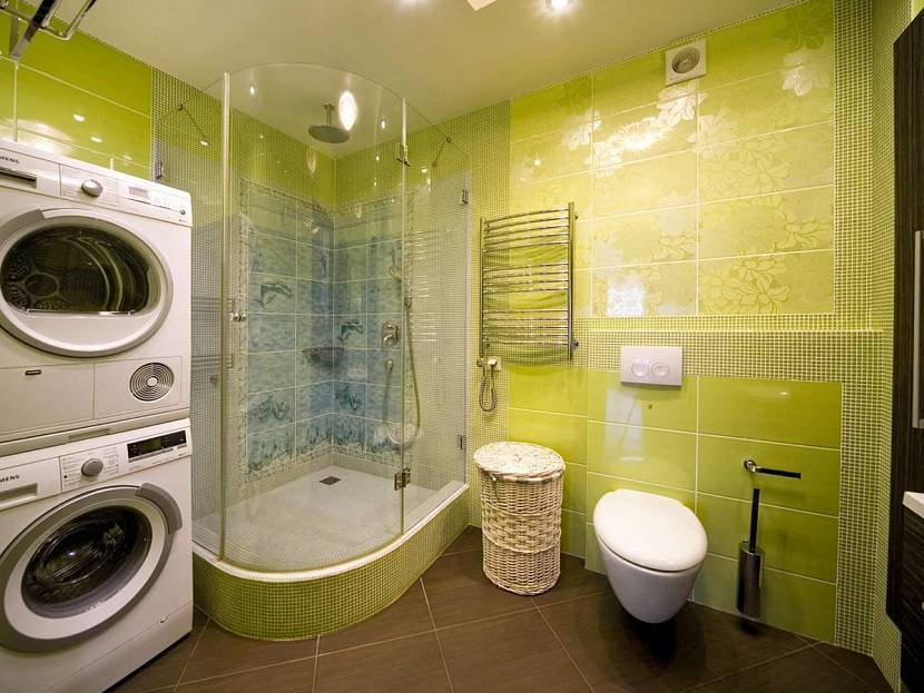 Вместо ванны можно установить душевую кабину или обустроить душевой уголок, а на освободившемся месте поставить стиральную машину