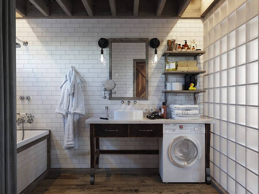 В индустриальном стиле ванную прячут за полупрозрачными панелями. Оригинально смотрится кабина, оформленная под заводскую душевую. Вместо привычной мебели дизайнеры советуют использовать стеллажи. Стиральную машинку монтируют у основания стойки.