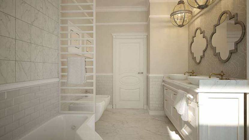 Интерьер с обилием деталей подходит для просторных помещений. В маленьком санузле сложно гармонично разместить оформление с роскошной отделкой. Симметрия классического стиля встречается в парных элементах (светильниках, полках, двойном умывальнике). На стену вешают зеркало в массивной раме, по периметру потолка – молдинги.