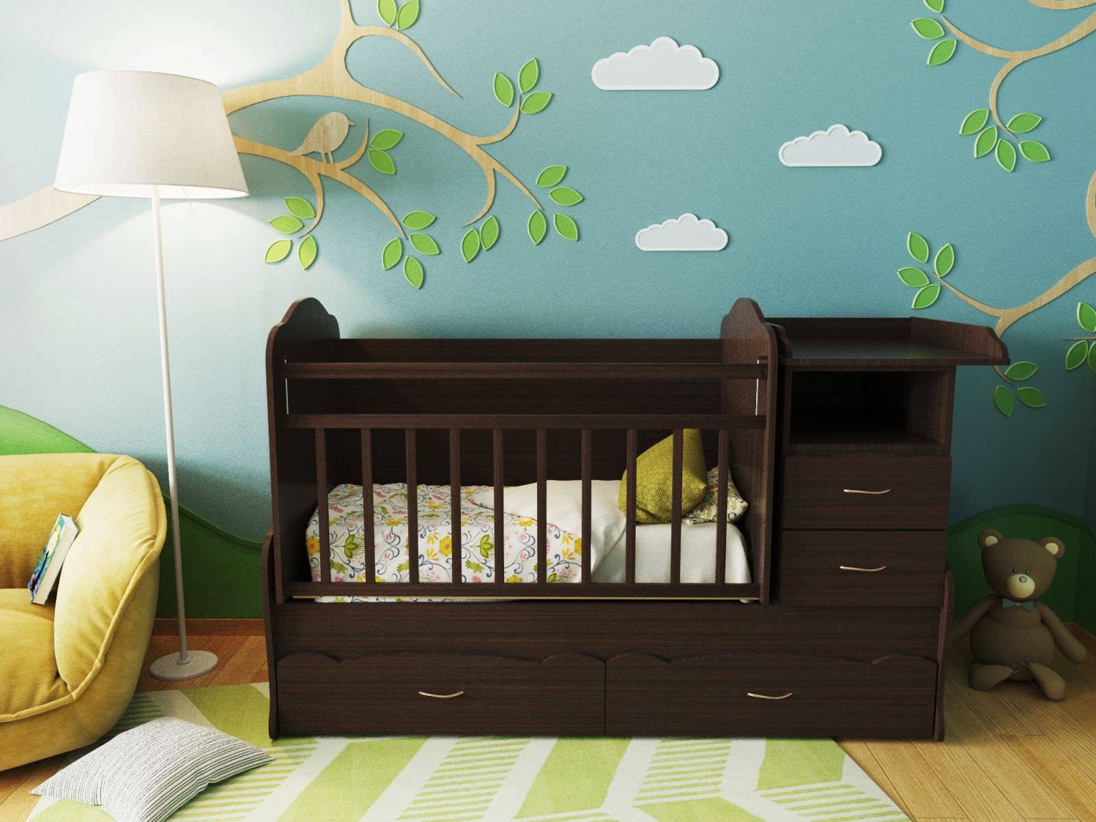 Другой тип кроватей-чердаков предназначен для новорожденных. Кровать присоединена к пеленальному столику, поэтому маме будет удобно пеленать ребенка и укладывать его спать. Кроватка оснащена полками для хранения всяких мелочей. Такое спальное место не должно быть слишком большим (ребенку будет страшно и неудобно) и слишком маленьким (малыш слишком быстро растет).