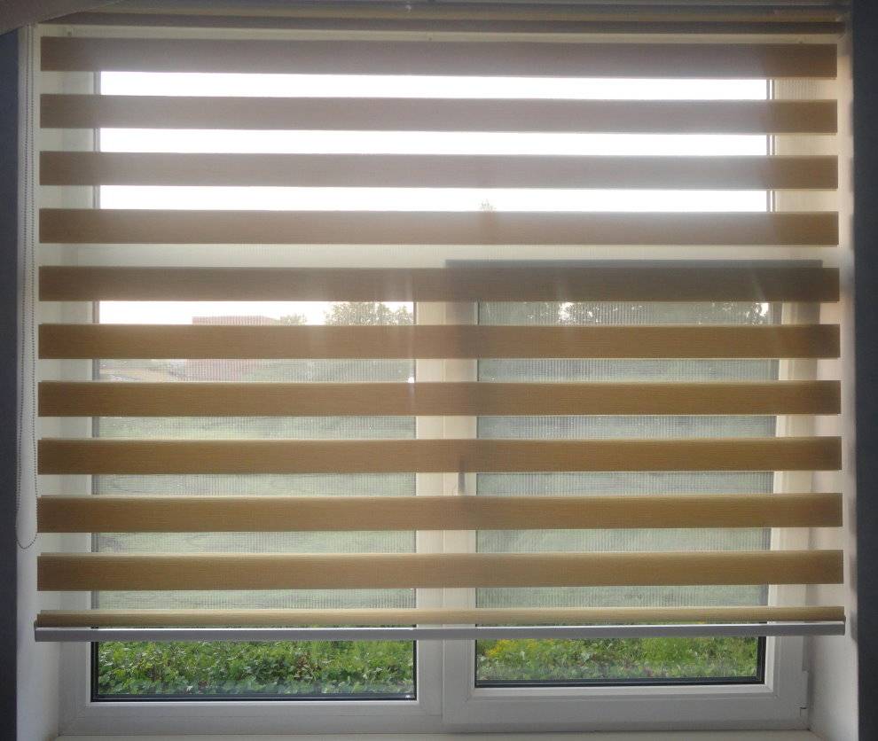 На окно лучше повесить короткие шторы, например, рулонные “день-ночь”, с помощью которых очень удобно регулировать степень освещенности рабочего места