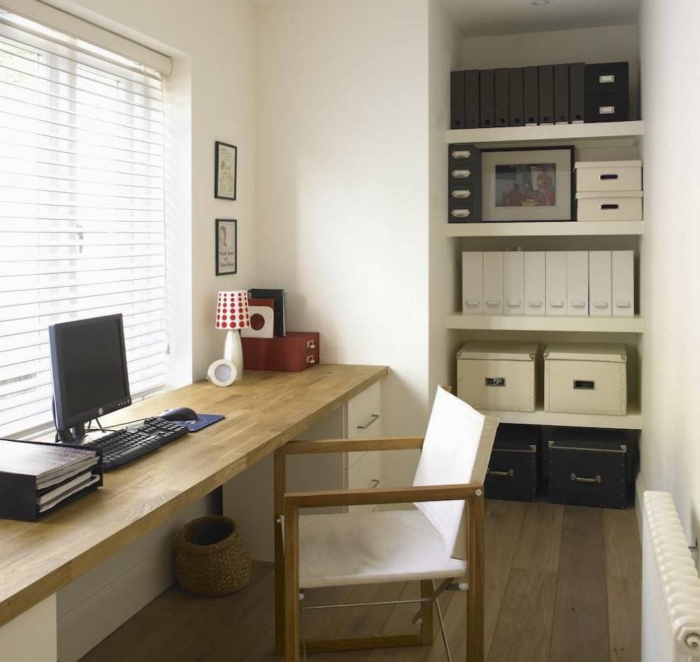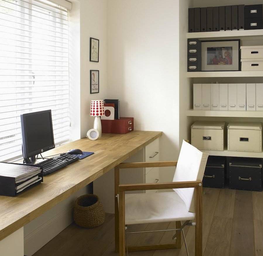Длинный стол на ширину всей стены с окном. Такой вариант позволяет поместить вместительную систему хранения под столешницей и сделать пространство стен по бокам открытым. Что зрительно не загромождает комнату.
