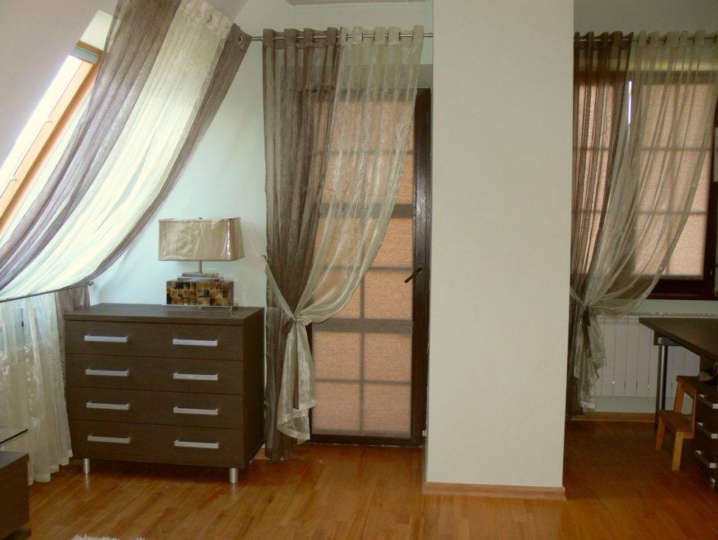- Такой вариант позволяет сэкономить семейный бюджет, так как покупка штор обойдется дешевле, чем приобретение межкомнатных дверей, их доставка и монтаж.
