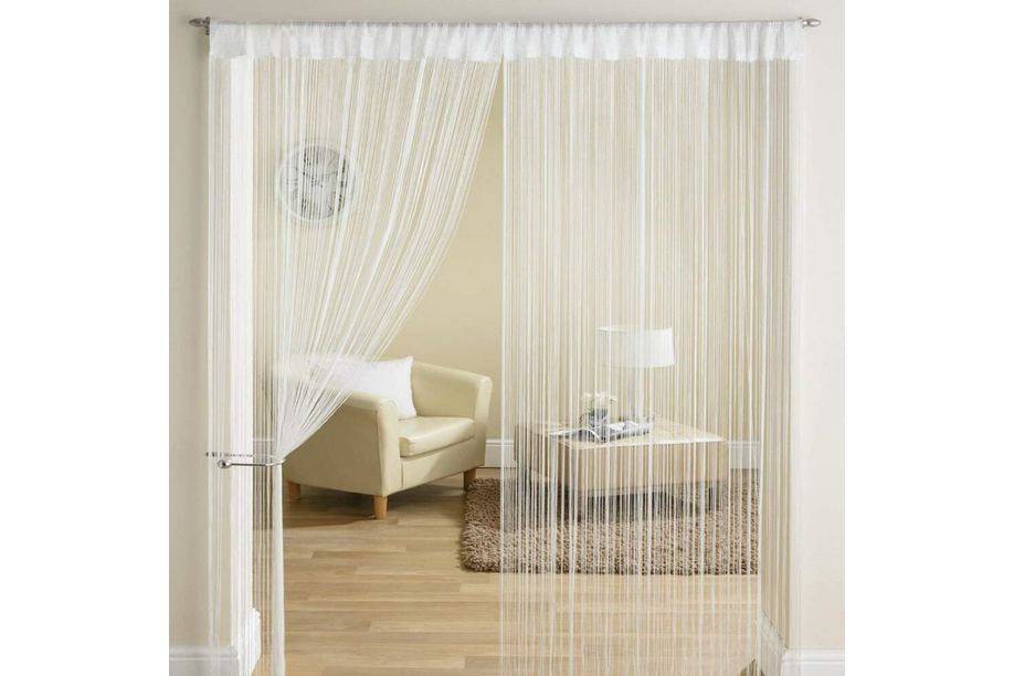 Современные шторы из нитей могут быть выполнены в одном или сразу нескольких цветах, чередующихся между собой. Из украшений используются пластиковые и деревянные бусины, спирали и банты. Гармонично смотрится гостиная, где кисеей оформлен одновременно и оконный, и дверной проемы.