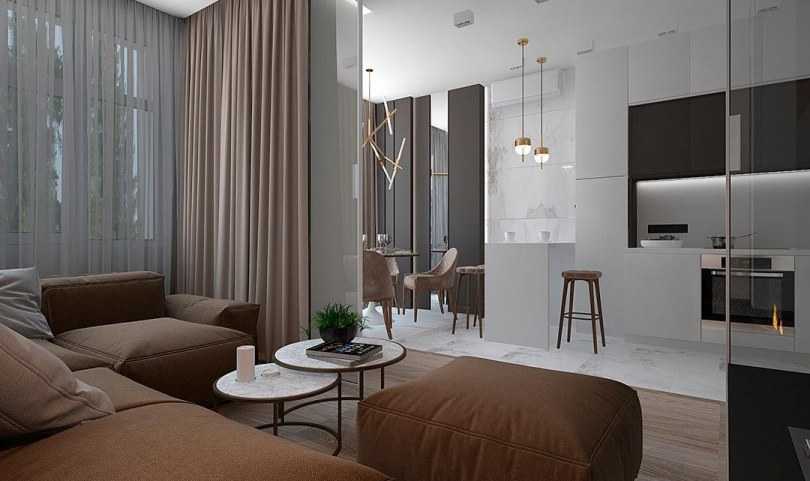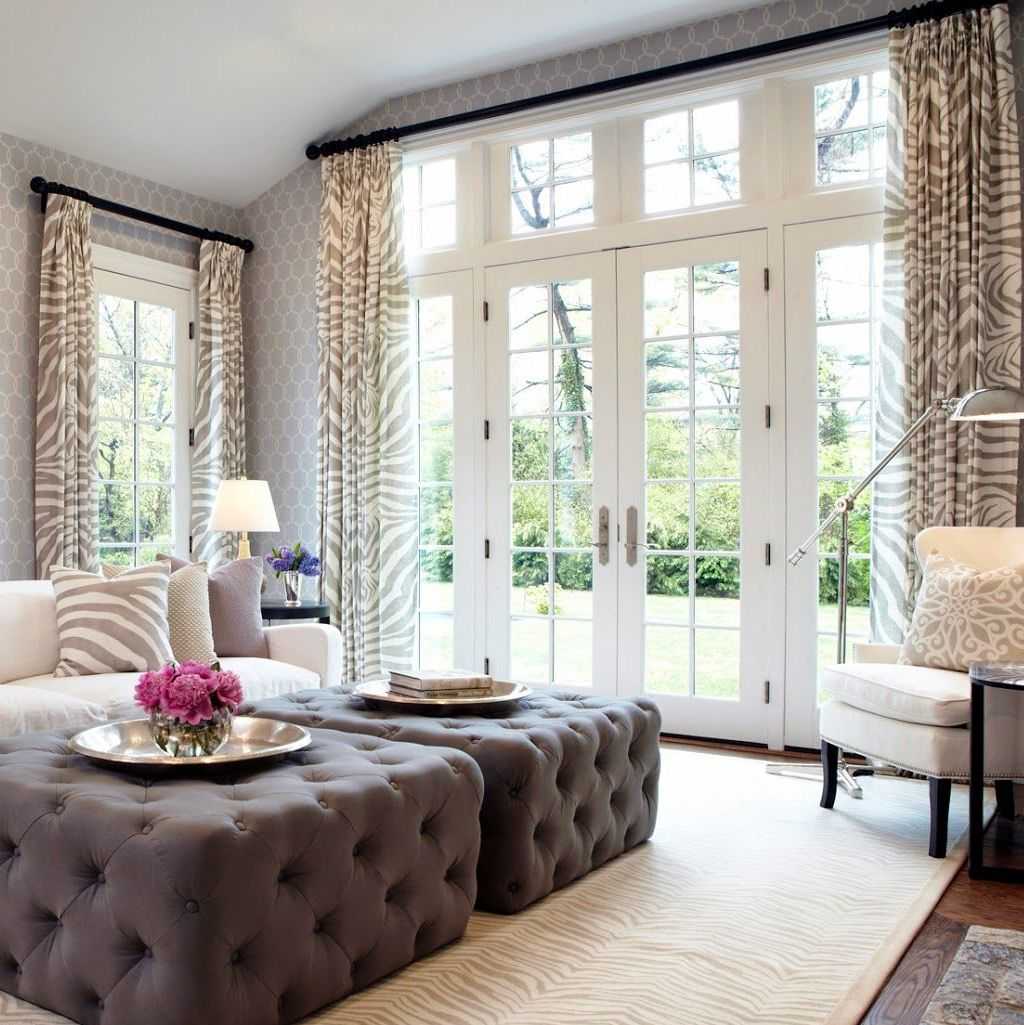 Для светлой и большой гостиной подходят шторы на люверсах, для пошива которых в основном используют стираный лен. Для небольших гостиных подходят шторы в скандинавском стиле, подразумевающем использование материалов светлого оттенка. Специалисты советуют сочетать шторы из хлопка или льна с тюлем или шифоном.