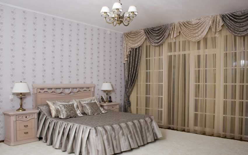 Сочетание умеренно темных портьер и легкого тюля отлично смотрится в большой светлой спальне.