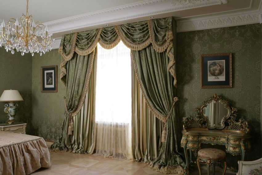 Традиционным вариантом можно считать раздвижные портьеры с ламбрекеном из шелка. Они могут украшаться кистями, бахромой и собираться заколками.