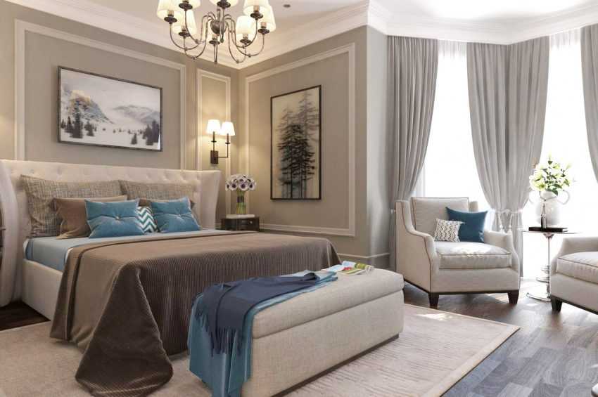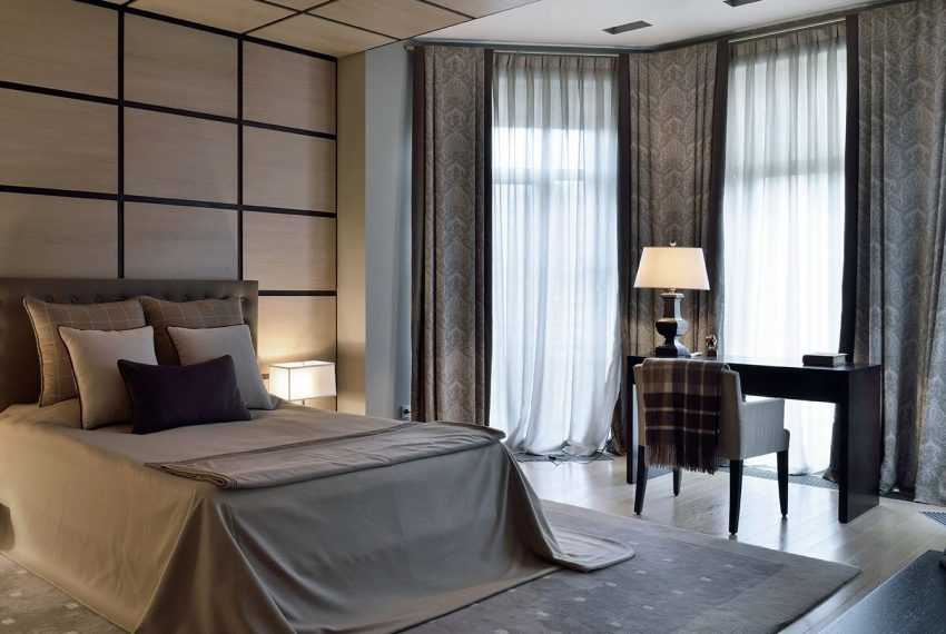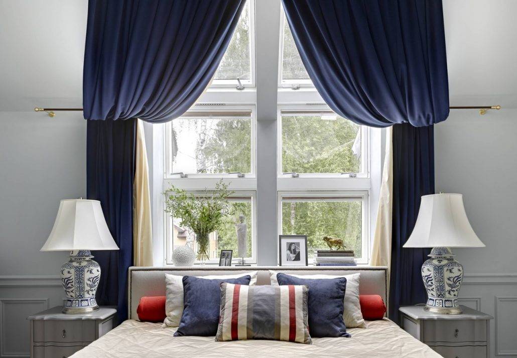 Дополнительная ткань выполняет роль прокладки и защищает комнату от прямых солнечных лучей, а шторы от выгорания. Шторы и занавески разных материалов и цветов – самый выигрышный вариант. Объемные занавески с декоративными элементами, драпировкой и складками дополнят большую спальню изысканностью и элегантностью