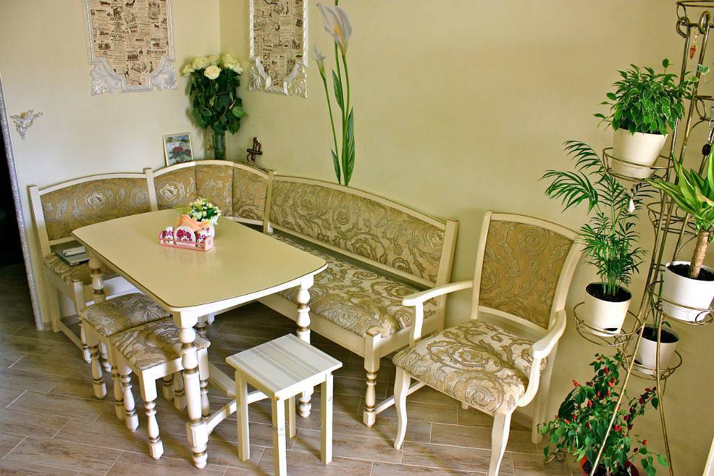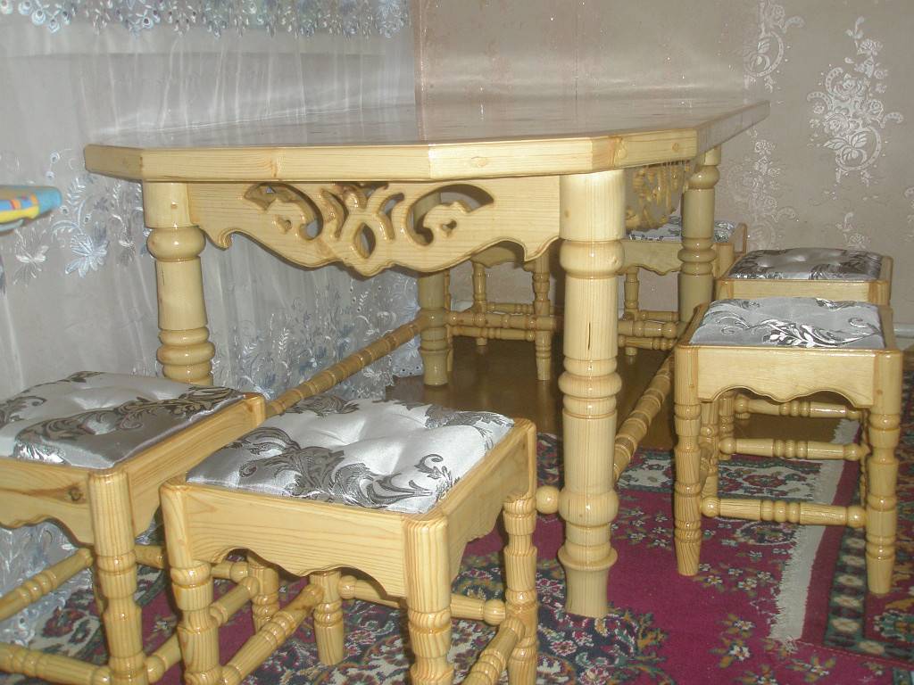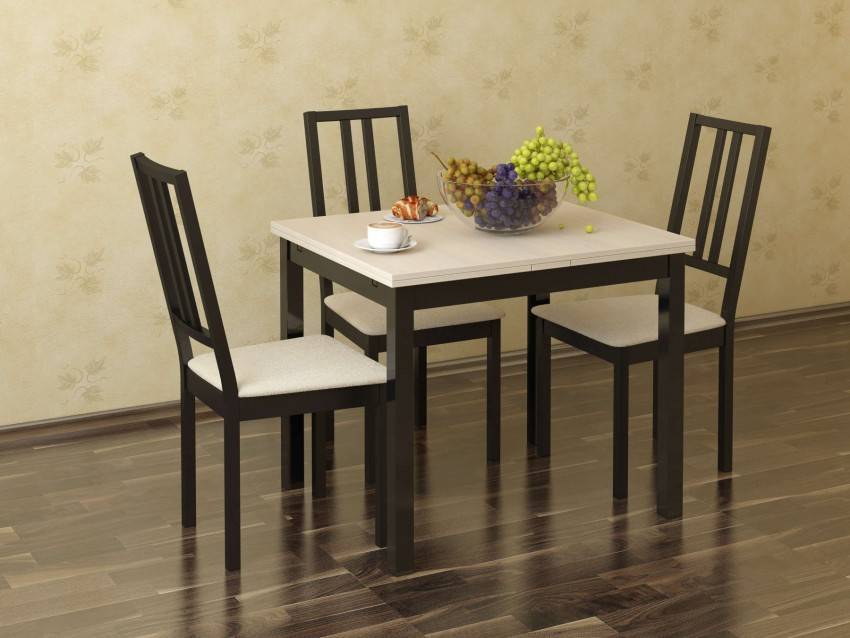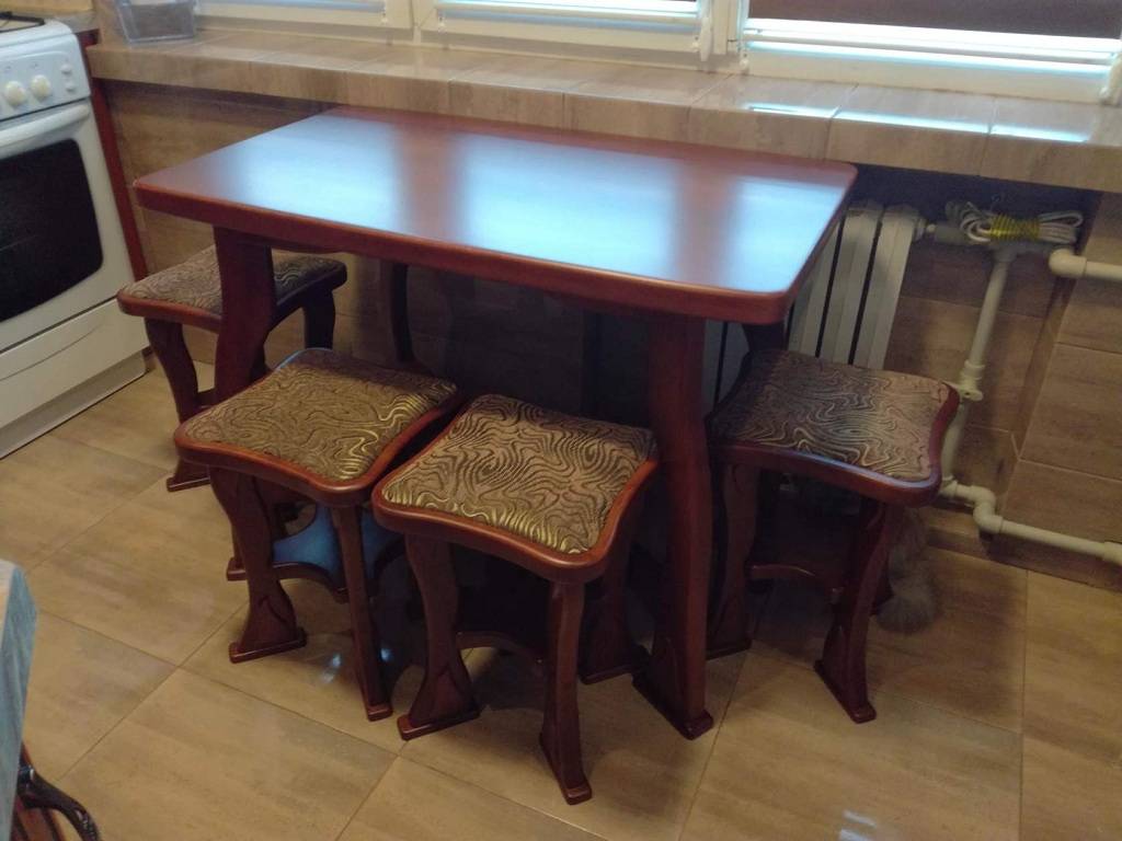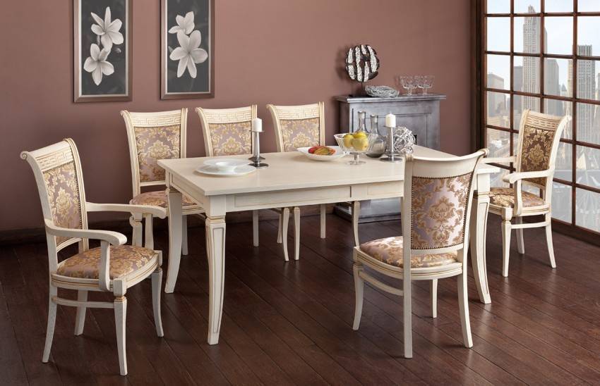 Натуральное дерево – красивый и благородный материал. Чаще всего такой каркас совмещают с классическими расцветками ткани или с кожей. Подобный образ не подойдет под модерн или хай-тек. Так как мягкость дерева идеально вписывается скорее в деревенский, стиль кантри или нетленную классику. Какие ещё можно подобрать столы и стулья для кухни