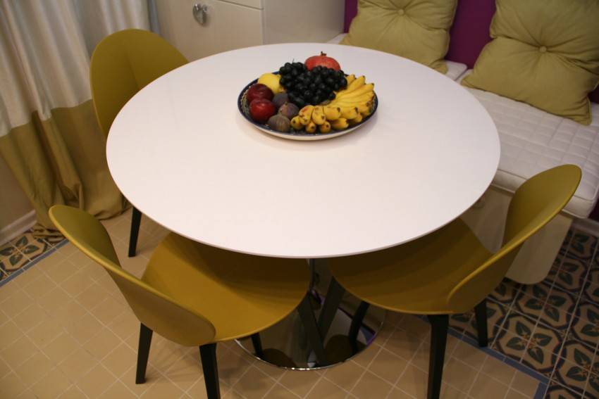 Например, для светлого круглого стола идеально подойдут табуреты в пастельной гамме со скругленным сиденьем.